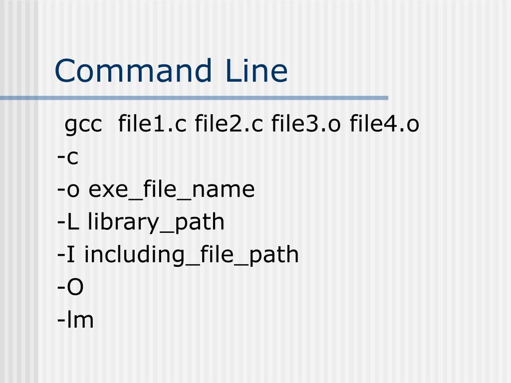 Command Line gcc file1.c file2.c file3.o file4.o -c -o exe_file_name -L library_path -I including_file_path -O -lm