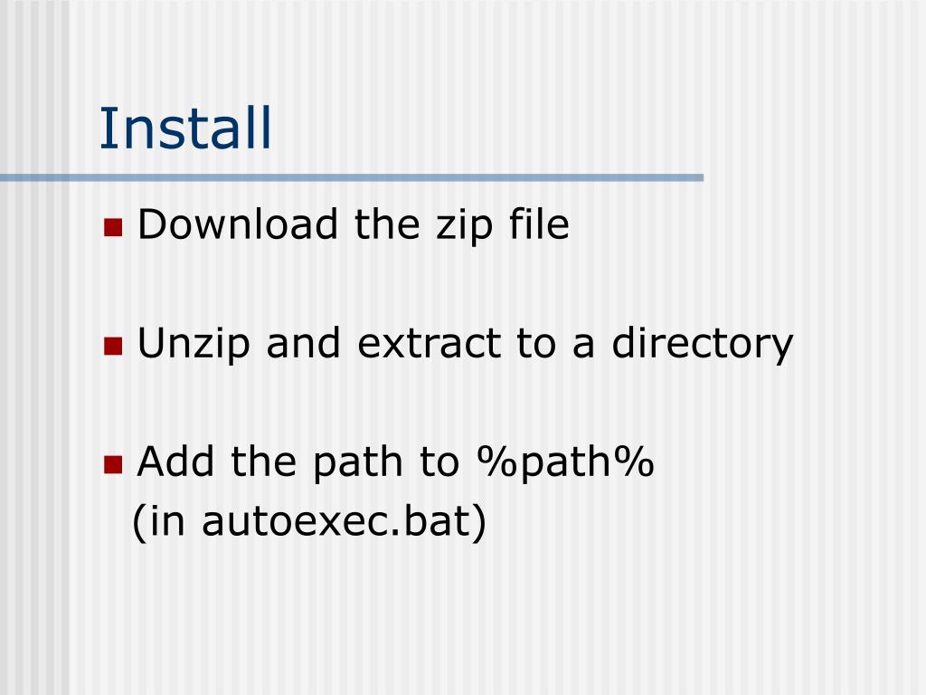 Install • Download the zip file • Unzip and extract to a directory • Add the path to %path% (in autoexec.bat)