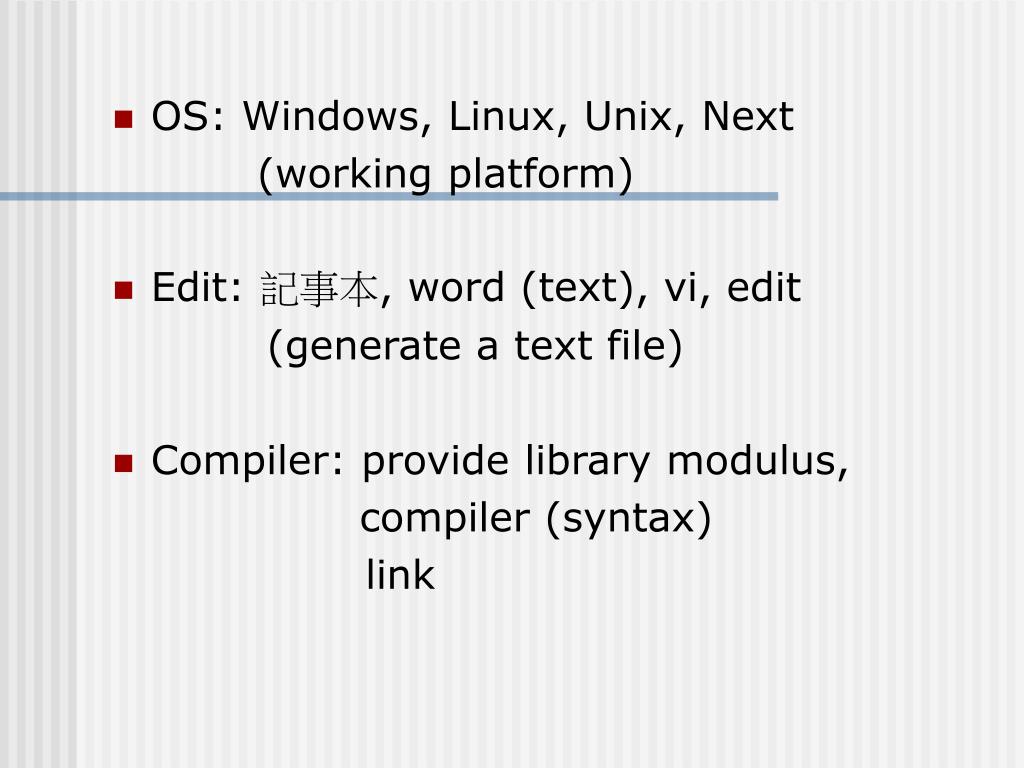 OS: Windows, Linux, Unix, Next (working platform) • Edit: 記事本, word (text), vi, edit (generate a text file) • Compiler: provide library modulus, compiler (syntax) link