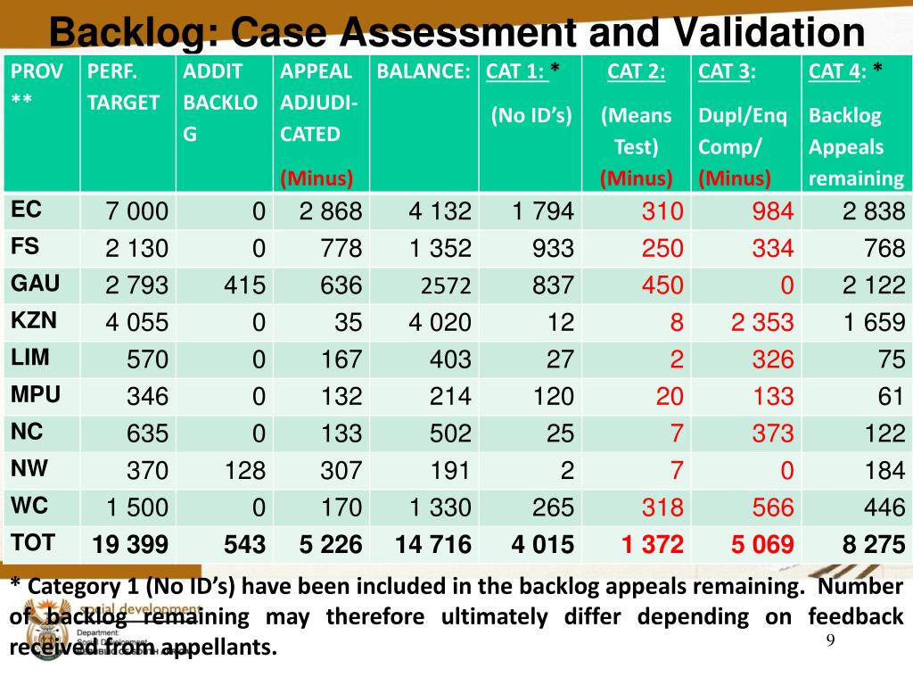 CASE ASSESSMENT AND VALIDATION • During case assessment and validation of the 19 399 appeal letters received (approximated backlog), the following were established: • Category 1: No ID – Letters sent to appellants requesting copies of identity documents. • Category 2: Means Test – Appeals by beneficiaries on decisions made prior to 16 September 2011 referred to SASSA for consideration.