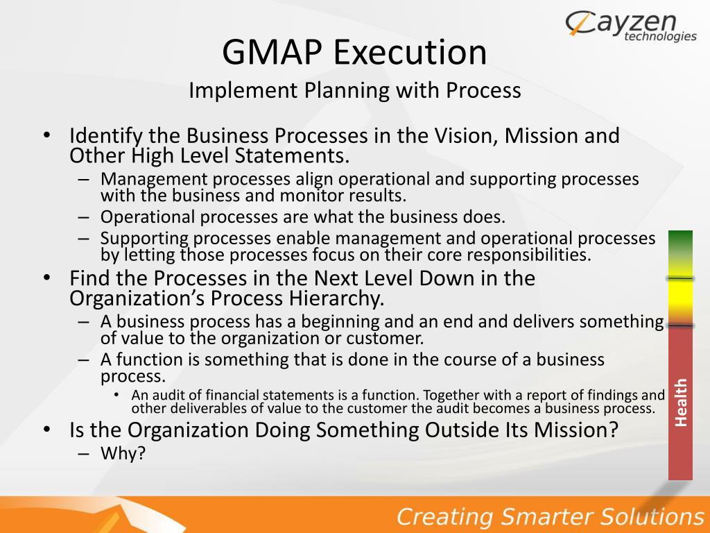 GMAP ExecutionImplement Planning with Process • Identify the Business Processes in the Vision, Mission and Other High Level Statements. • Management processes align operational and supporting processes with the business and monitor results. • Operational processes are what the business does. • Supporting processes enable management and operational processes by letting those processes focus on their core responsibilities. • Find the Processes in the Next Level Down in the Organization’s Process Hierarchy. • A business process has a beginning and an end and delivers something of value to the organization or customer. • A function is something that is done in the course of a business process. • An audit of financial statements is a function. Together with a report of findings and other deliverables of value to the customer the audit becomes a business process. • Is the Organization Doing Something Outside Its Mission? • Why? Health