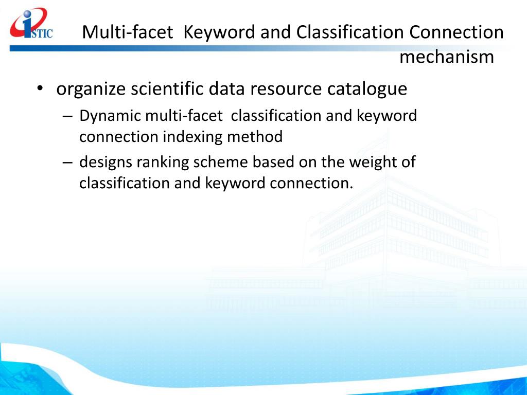 Multi-facet Keyword and Classification Connection mechanism • organize scientific data resource catalogue • Dynamic multi-facetclassification and keyword connection indexing method • designs ranking scheme based on the weight of classification and keyword connection.