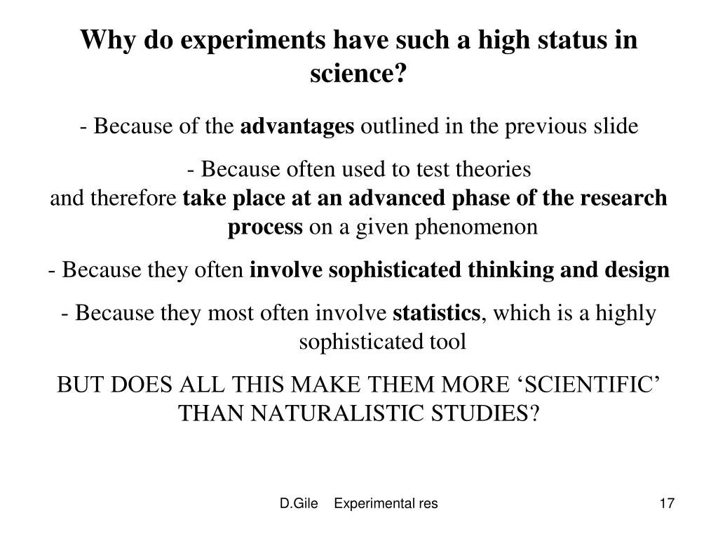 Why do experiments have such a high status in science? - Because of the advantages outlined in the previous slide - Because often used to test theories and therefore take place at an advanced phase of the research process on a given phenomenon - Because they often involve sophisticated thinking and design - Because they most often involve statistics, which is a highly sophisticated tool BUT DOES ALL THIS MAKE THEM MORE ‘SCIENTIFIC’ THAN NATURALISTIC STUDIES? D.Gile Experimental res