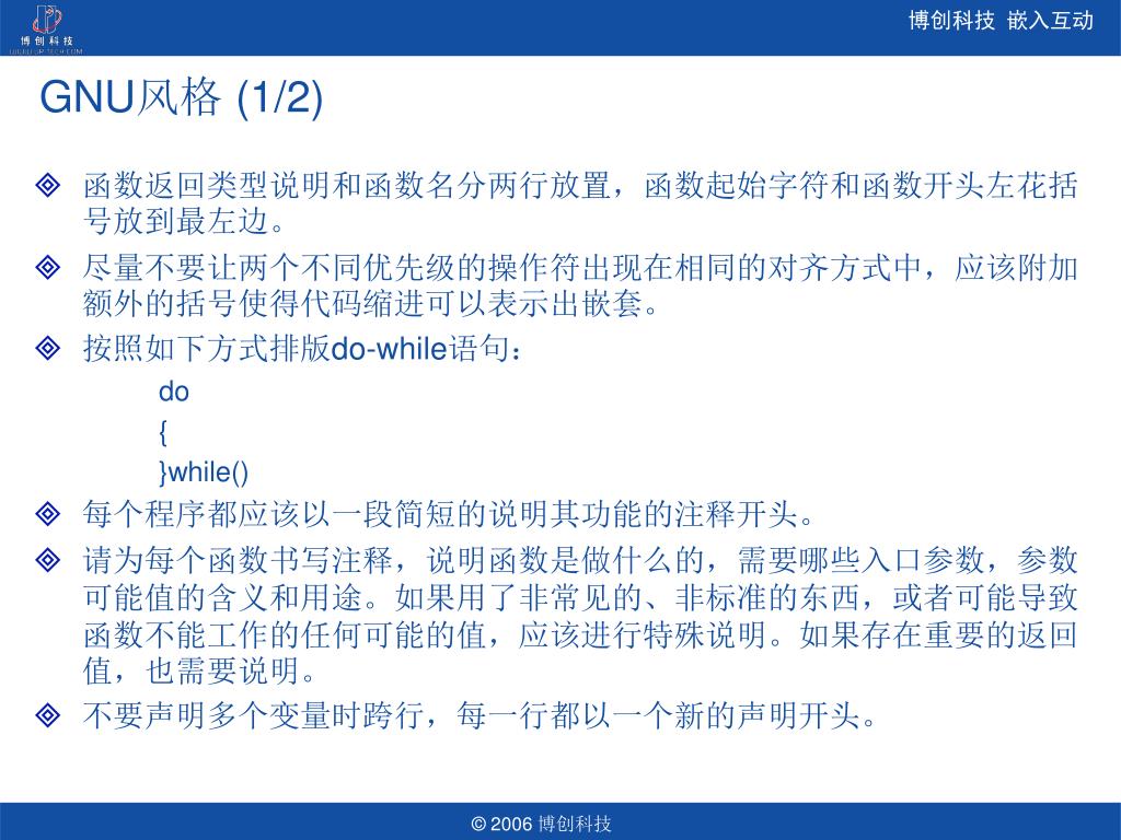GNU风格 (1/2) • 函数返回类型说明和函数名分两行放置,函数起始字符和函数开头左花括号放到最左边。 • 尽量不要让两个不同优先级的操作符出现在相同的对齐方式中,应该附加额外的括号使得代码缩进可以表示出嵌套。 • 按照如下方式排版do-while语句: do { }while() • 每个程序都应该以一段简短的说明其功能的注释开头。 • 请为每个函数书写注释,说明函数是做什么的,需要哪些入口参数,参数可能值的含义和用途。如果用了非常见的、非标准的东西,或者可能导致函数不能工作的任何可能的值,应该进行特殊说明。如果存在重要的返回值,也需要说明。 • 不要声明多个变量时跨行,每一行都以一个新的声明开头。