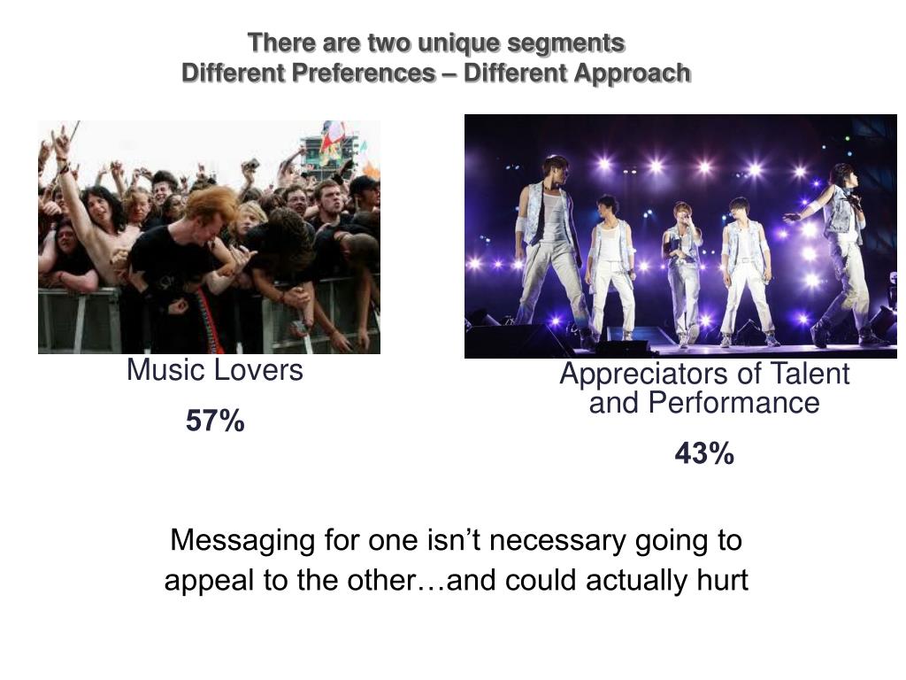 There are two unique segments Different Preferences – Different Approach Messaging for one isn’t necessary going to appeal to the other…and could actually hurt Music Lovers 57% Appreciators of Talent and Performance 43%