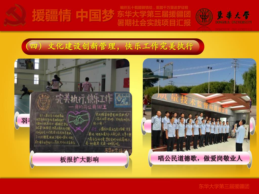羽毛球赛显身手,劳逸结合效率高 篮球增进友谊 板报扩大影响 唱公民道德歌,做爱岗敬业人 编织五十载援疆情结,重踏千万里追梦征程 东华大学第三届援疆团 暑期社会实践项目汇报 援疆情 中国梦 (四)文化建设创新管理,快乐工作完美执行 东华大学第三届援疆团