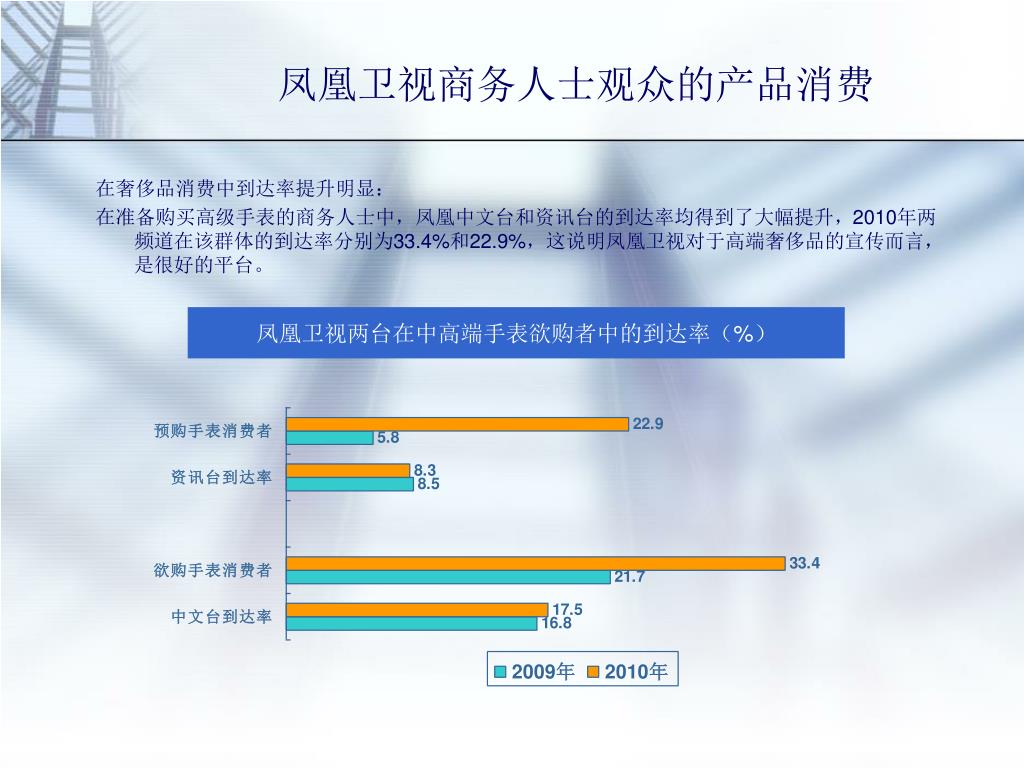 凤凰卫视商务人士观众的产品消费 在奢侈品消费中到达率提升明显: 在准备购买高级手表的商务人士中,凤凰中文台和资讯台的到达率均得到了大幅提升,2010年两频道在该群体的到达率分别为33.4%和22.9%,这说明凤凰卫视对于高端奢侈品的宣传而言,是很好的平台。 凤凰卫视两台在中高端手表欲购者中的到达率(%)