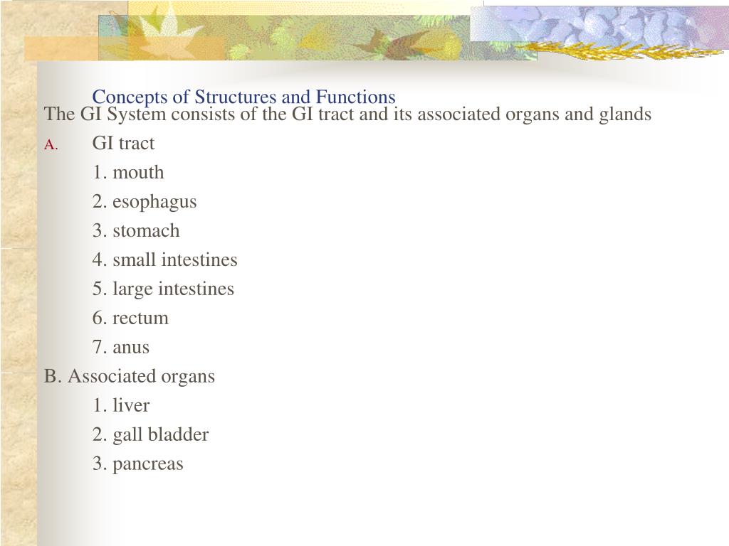 Concepts of Structures and Functions The GI System consists of the GI tract and its associated organs and glands • GI tract 1. mouth 2. esophagus 3. stomach 4. small intestines 5. large intestines 6. rectum 7. anus B. Associated organs 1. liver 2. gall bladder 3. pancreas