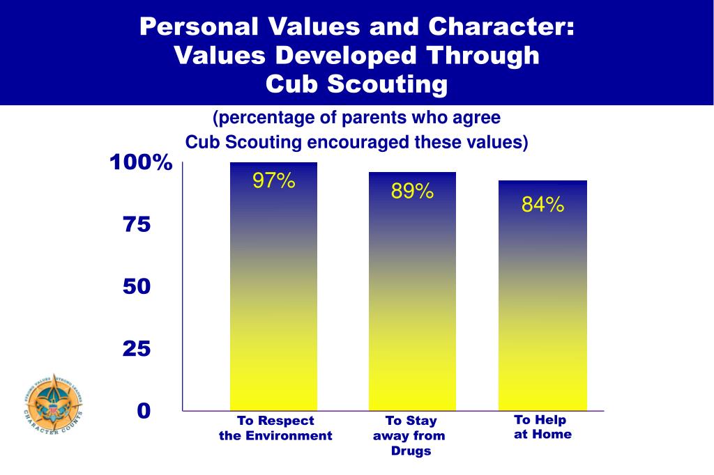 100% 75 50 25 0 97% 89% 84% To Respect the Environment To Stay away from Drugs To Help at Home Personal Values and Character:Values Developed ThroughCub Scouting (percentage of parents who agree Cub Scouting encouraged these values)