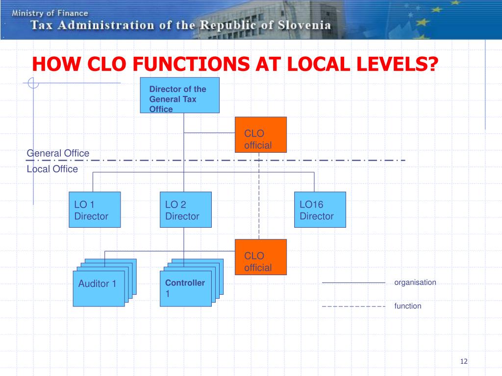 LO 2 Director CLO official LO 1 Director CLO official Controller1 Auditor 1 LO16 Director HOW CLO FUNCTIONS AT LOCAL LEVELS? Director of the General Tax Office General Office Local Office organisation function