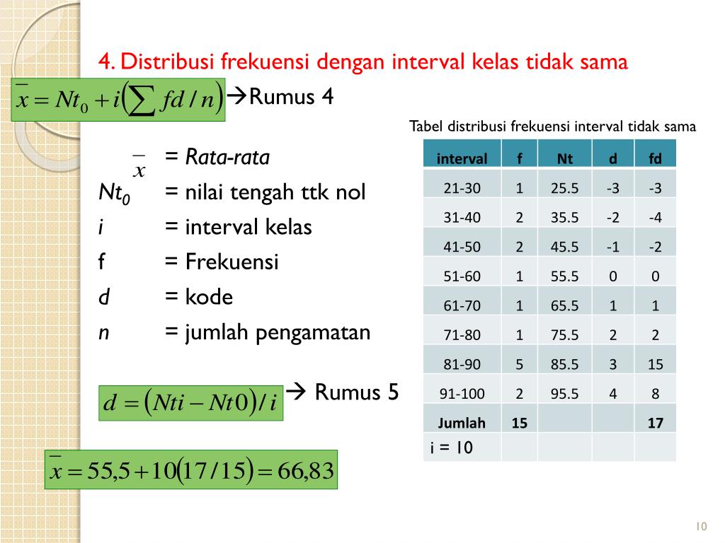 4. Distribusi frekuensi dengan interval kelas tidak sama Rumus 4 Tabel distribusi frekuensi interval tidak sama = Rata-rata Nt0 = nilai tengah ttk nol i = interval kelas f = Frekuensi d = kode n = jumlah pengamatan Rumus 5