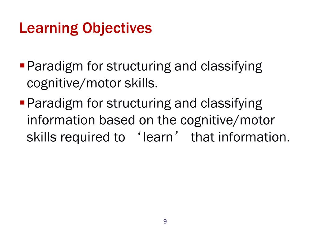 Learning Objectives • Paradigm for structuring and classifying cognitive/motor skills. • Paradigm for structuring and classifying information based on the cognitive/motor skills required to ‘learn’ that information.