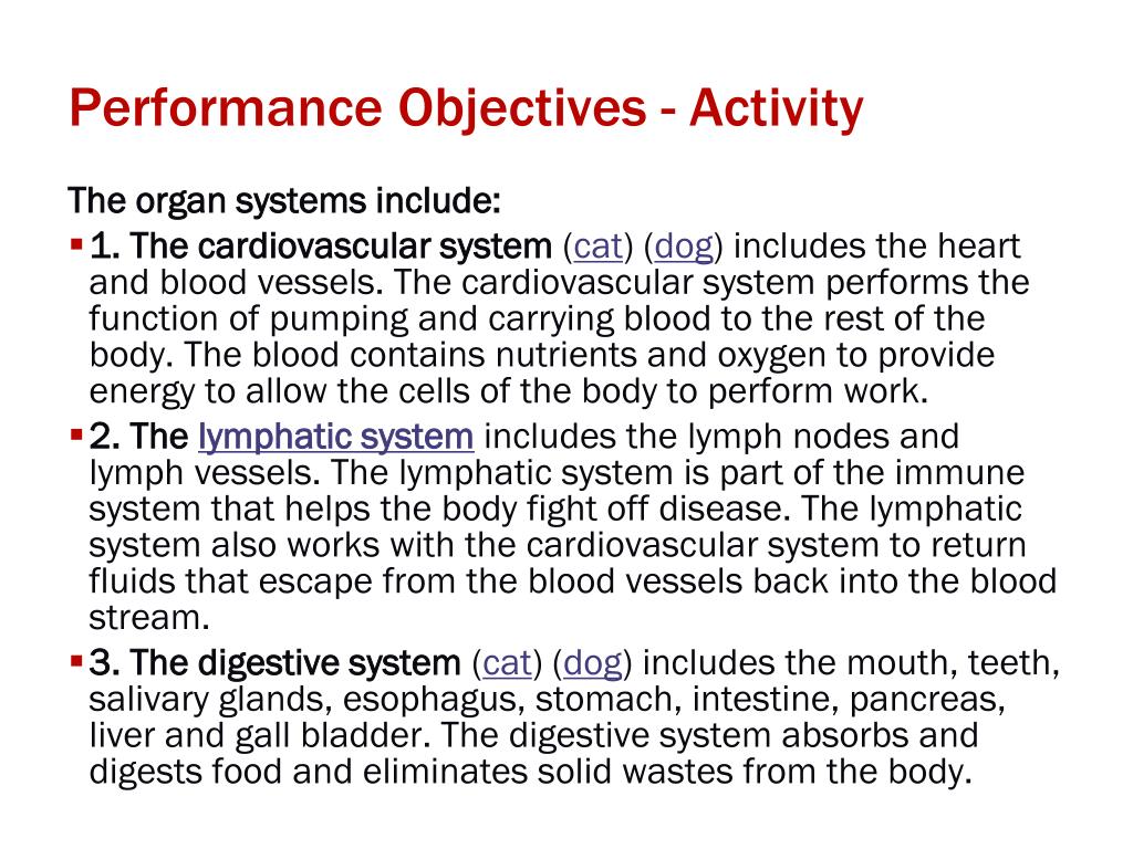Performance Objectives - Activity The organ systems include: • 1. The cardiovascular system (cat) (dog)includes the heart and blood vessels. The cardiovascular system performs the function of pumping and carrying blood to the rest of the body. The blood contains nutrients and oxygen to provide energy to allow the cells of the body to perform work. • 2. The lymphatic system includes the lymph nodes and lymph vessels. The lymphatic system is part of the immune system that helps the body fight off disease. The lymphatic system also works with the cardiovascular system to return fluids that escape from the blood vessels back into the blood stream. • 3. The digestive system (cat) (dog) includes the mouth, teeth, salivary glands, esophagus, stomach, intestine, pancreas, liver and gall bladder. The digestive system absorbs and digests food and eliminates solid wastes from the body.