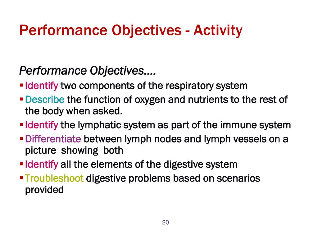 Performance Objectives - Activity Performance Objectives…. • Identify two components of the respiratory system • Describe the function of oxygen and nutrients to the rest of the body when asked. • Identify the lymphatic system as part of the immune system • Differentiate between lymph nodes and lymph vessels on a picture showing both • Identify all the elements of the digestive system • Troubleshoot digestive problems based on scenarios provided