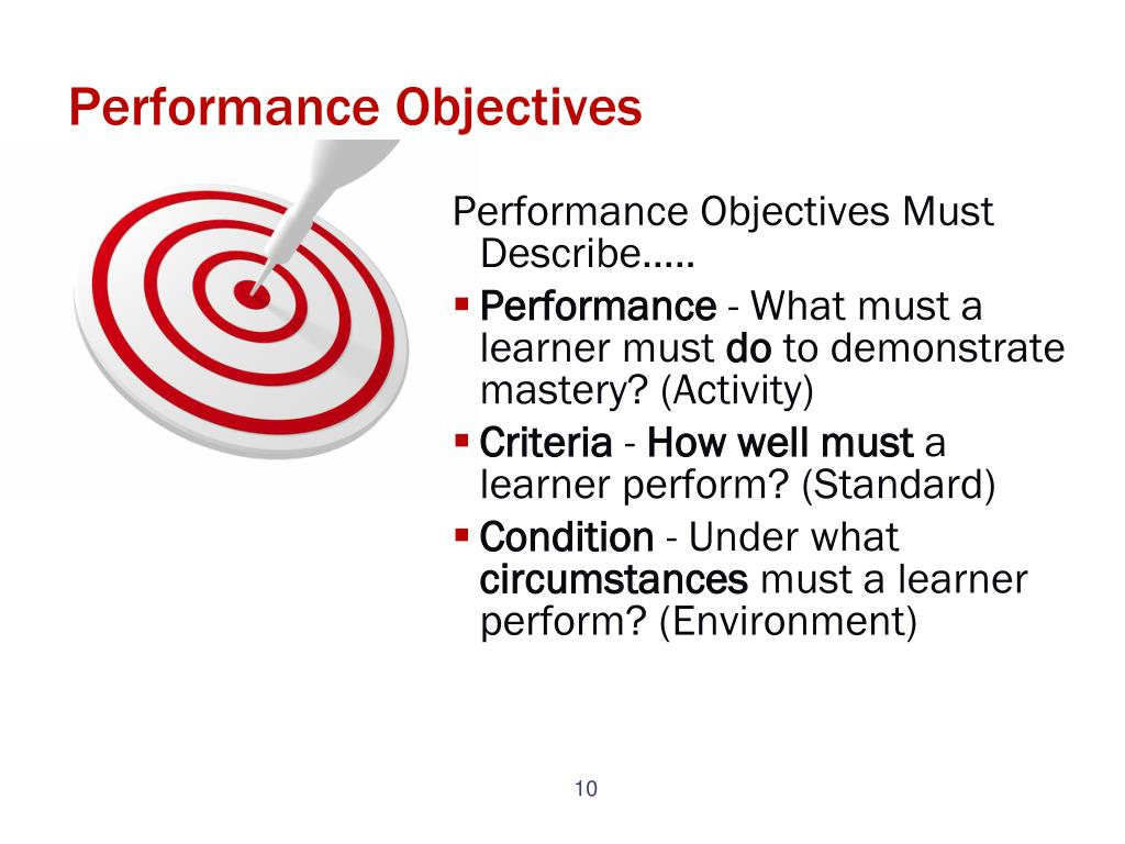 Performance Objectives Performance Objectives Must Describe….. • Performance - What must a learner must do to demonstrate mastery? (Activity) • Criteria - How well must a learner perform? (Standard) • Condition - Under what circumstances must a learner perform? (Environment)
