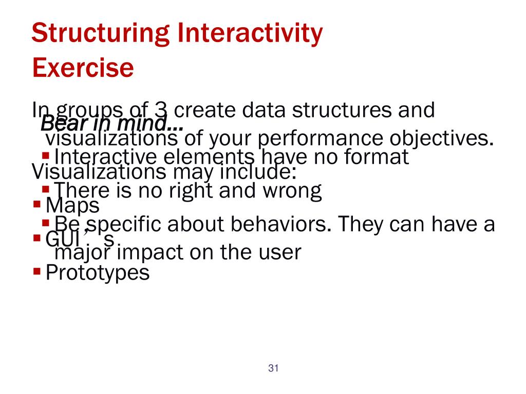 Structuring InteractivityExercise In groups of 3 create data structures and visualizations of your performance objectives. Visualizations may include: • Maps • GUI’s • Prototypes Bear in mind… • Interactive elements have no format • There is no right and wrong • Be specific about behaviors. They can have a major impact on the user