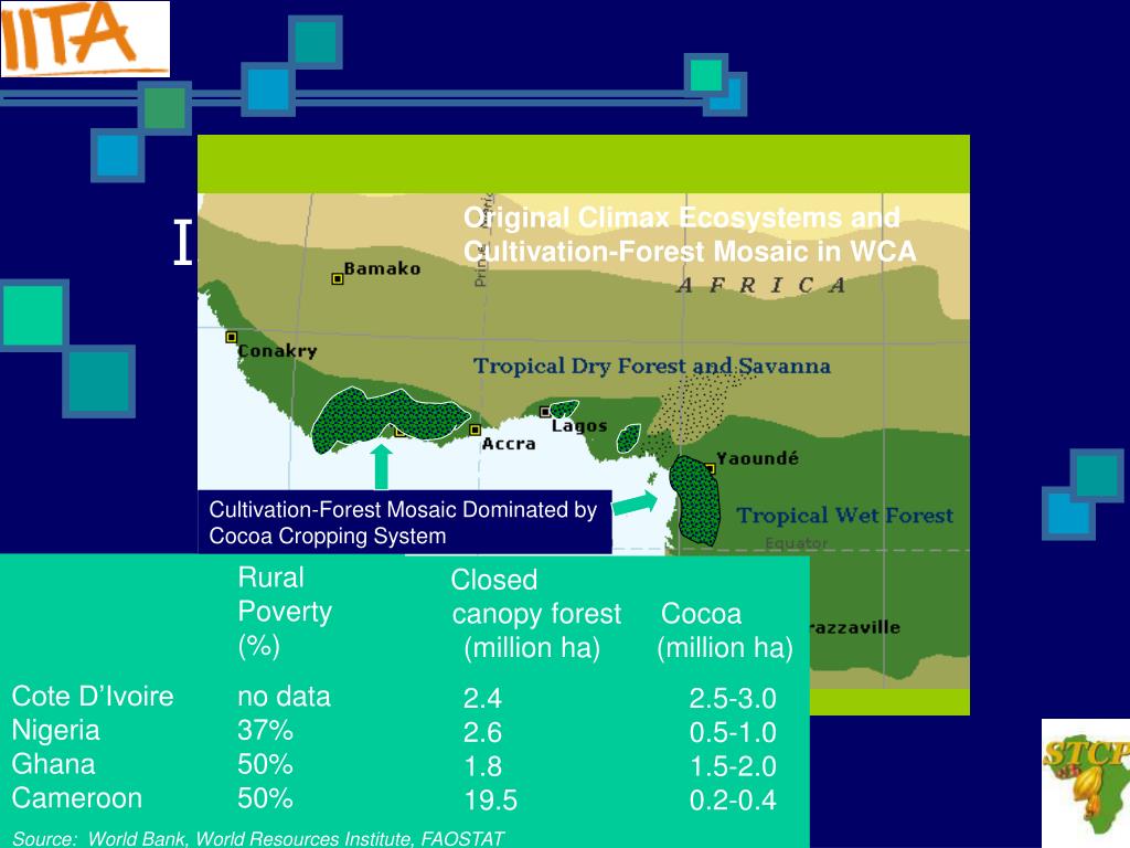 Introduction to the problem Original Climax Ecosystems and Cultivation-Forest Mosaic in WCA Cultivation-Forest Mosaic Dominated by Cocoa Cropping System Rural Poverty (%) Cote D’Ivoire no data Nigeria 37% Ghana 50% Cameroon 50% Annual Closed Deforestation canopy forest Cocoa (%) (million ha) (million ha) Cote D’Ivoire 3.5% 2.4 2.5-3.0 Nigeria 2.5% 2.6 0.5-1.0Ghana 1.7% 1.8 1.5-2.0Cameroon 0.89% 19.5 0.2-0.4 Source: World Bank, World Resources Institute, FAOSTAT