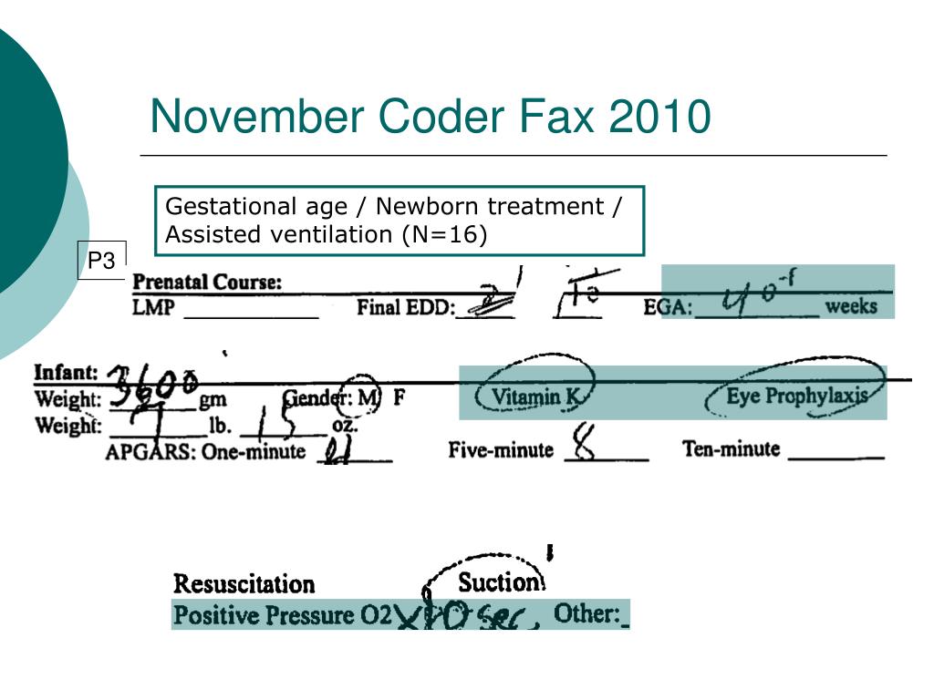 November Coder Fax 2010 Gestational age / Newborn treatment / Assisted ventilation (N=16) P3
