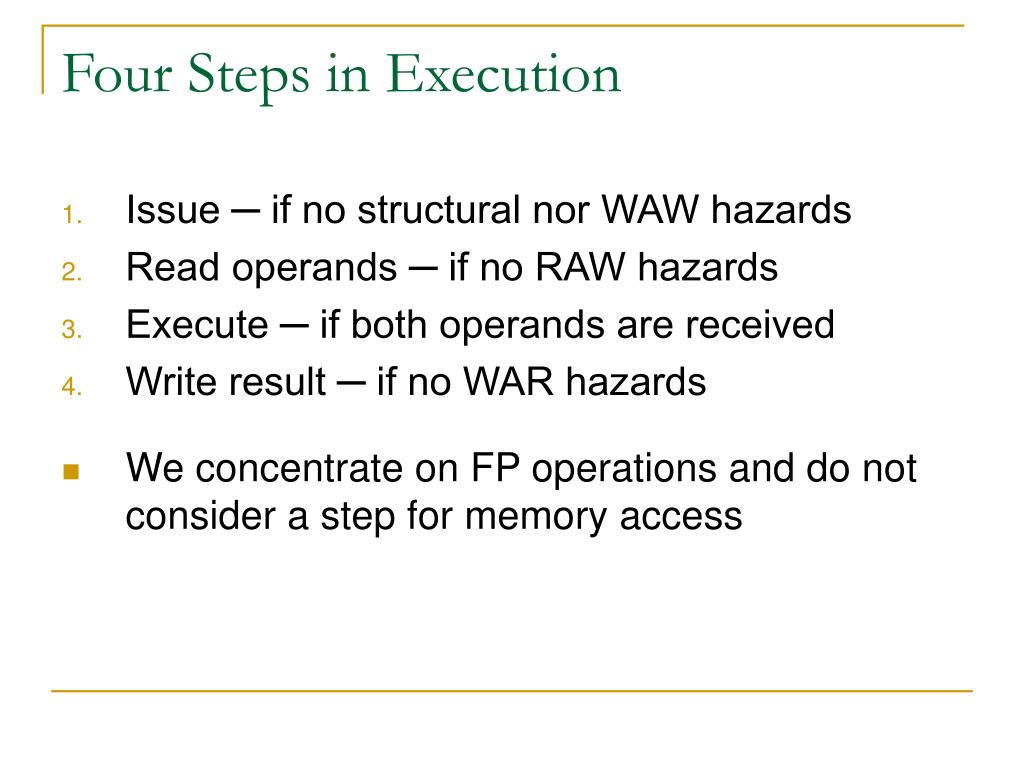 Four Steps in Execution • Issue ─ if no structural nor WAW hazards • Read operands ─ if no RAW hazards • Execute ─ if both operands are received • Write result ─ if no WAR hazards • We concentrate on FP operations and do not consider a step for memory access