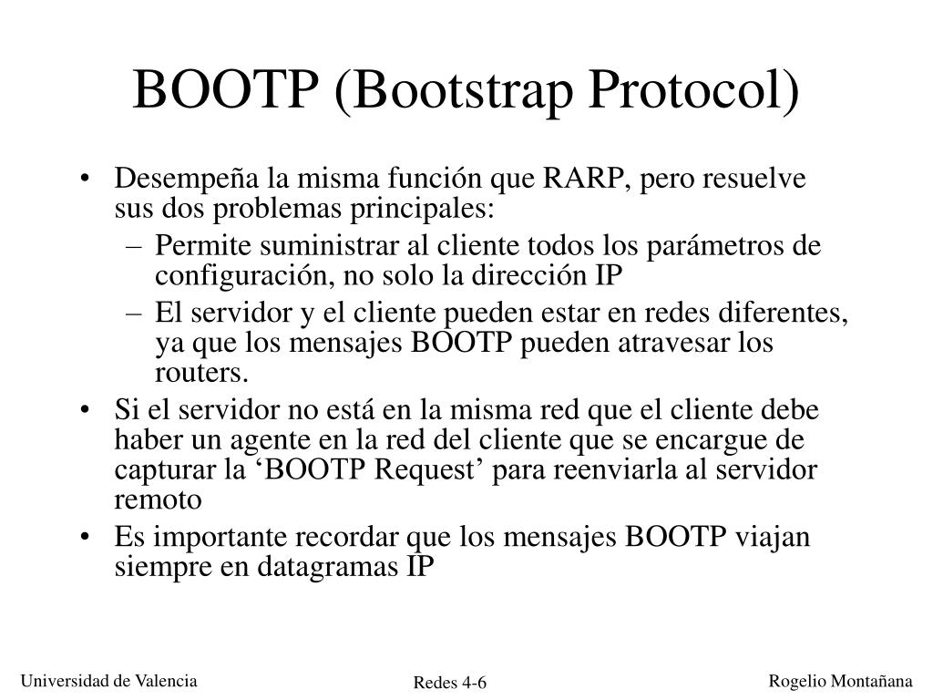 BOOTP (Bootstrap Protocol) • Desempeña la misma función que RARP, pero resuelve sus dos problemas principales: • Permite suministrar al cliente todos los parámetros de configuración, no solo la dirección IP • El servidor y el cliente pueden estar en redes diferentes, ya que los mensajes BOOTP pueden atravesar los routers. • Si el servidor no está en la misma red que el cliente debe haber un agente en la red del cliente que se encargue de capturar la ‘BOOTP Request’ para reenviarla al servidor remoto • Es importante recordar que los mensajes BOOTP viajan siempre en datagramas IP