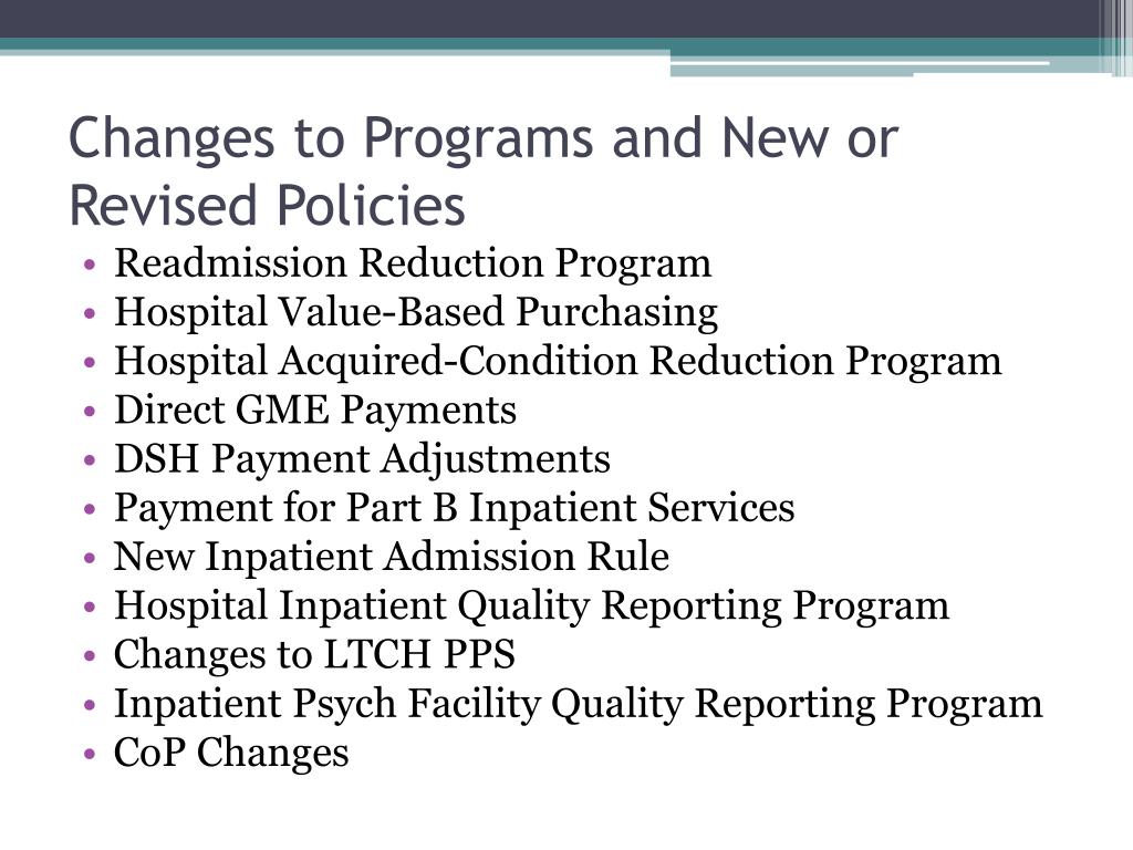 Changes to Programs and New or Revised Policies • Readmission Reduction Program • Hospital Value-Based Purchasing • Hospital Acquired-Condition Reduction Program • Direct GME Payments • DSH Payment Adjustments • Payment for Part B Inpatient Services • New Inpatient Admission Rule • Hospital Inpatient Quality Reporting Program • Changes to LTCH PPS • Inpatient Psych Facility Quality Reporting Program • CoP Changes