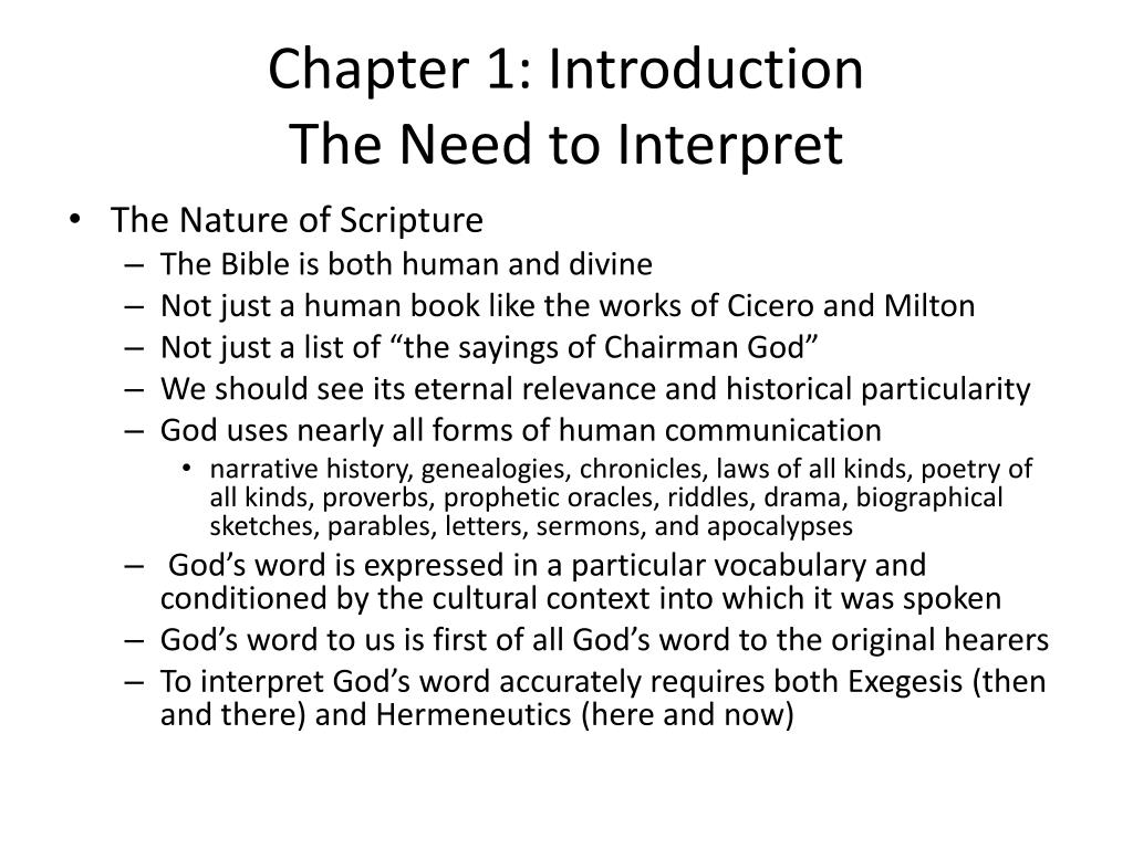 Chapter 1: IntroductionThe Need to Interpret • The Nature of Scripture • The Bible is both human and divine • Not just a human book like the works of Cicero and Milton • Not just a list of “the sayings of Chairman God” • We should see its eternal relevance and historical particularity • God uses nearly all forms of human communication • narrative history, genealogies, chronicles, laws of all kinds, poetry of all kinds, proverbs, prophetic oracles, riddles, drama, biographical sketches, parables, letters, sermons, and apocalypses • God’s word is expressed in a particular vocabulary and conditioned by the cultural context into which it was spoken • God’s word to us is first of all God’s word to the original hearers • To interpret God’s word accurately requires both Exegesis (then and there) and Hermeneutics (here and now)