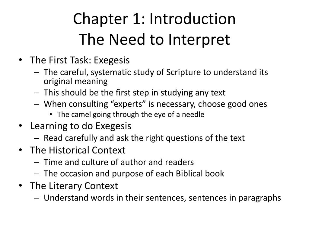 Chapter 1: IntroductionThe Need to Interpret • The First Task: Exegesis • The careful, systematic study of Scripture to understand its original meaning • This should be the first step in studying any text • When consulting “experts” is necessary, choose good ones • The camel going through the eye of a needle • Learning to do Exegesis • Read carefully and ask the right questions of the text • The Historical Context • Time and culture of author and readers • The occasion and purpose of each Biblical book • The Literary Context • Understand words in their sentences, sentences in paragraphs