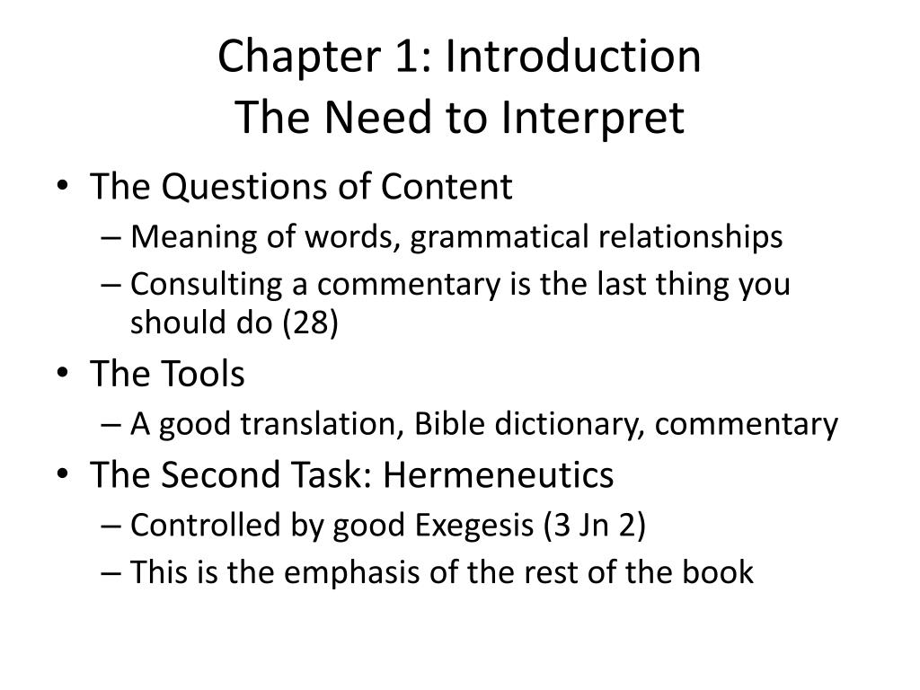 Chapter 1: IntroductionThe Need to Interpret • The Questions of Content • Meaning of words, grammatical relationships • Consulting a commentary is the last thing you should do (28) • The Tools • A good translation, Bible dictionary, commentary • The Second Task: Hermeneutics • Controlled by good Exegesis (3 Jn 2) • This is the emphasis of the rest of the book