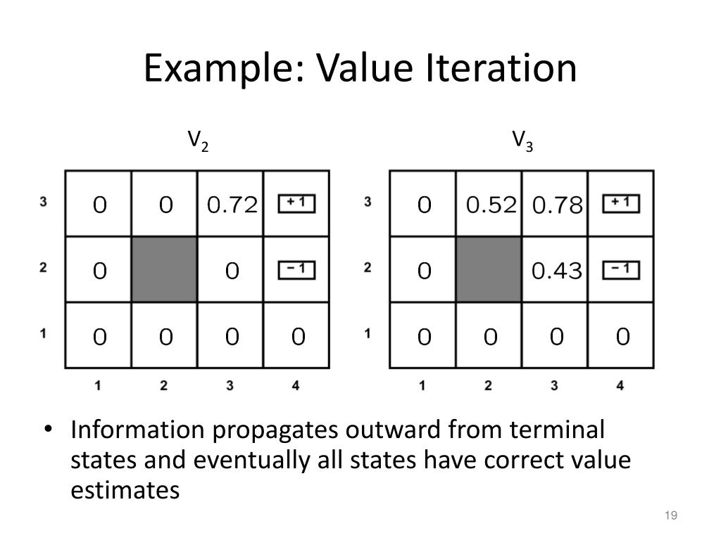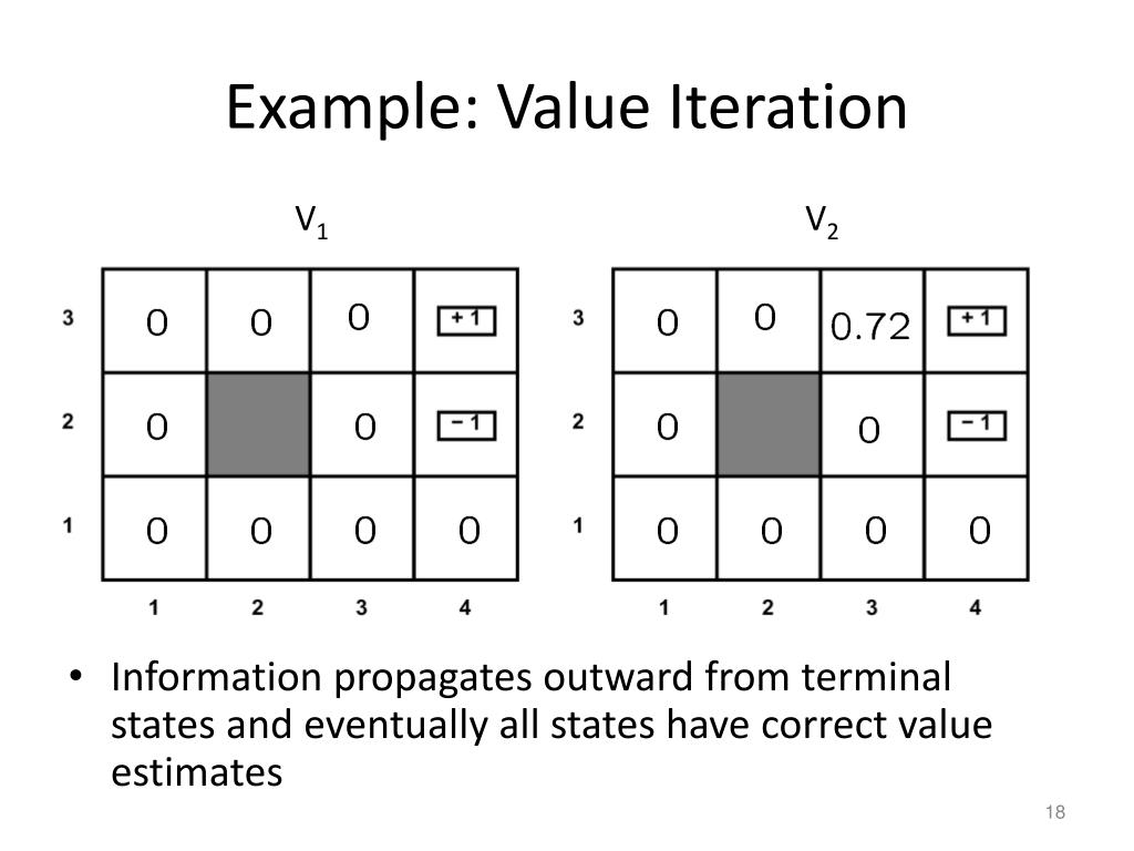Example: Value Iteration V1 V2 • Information propagates outward from terminal states and eventually all states have correct value estimates