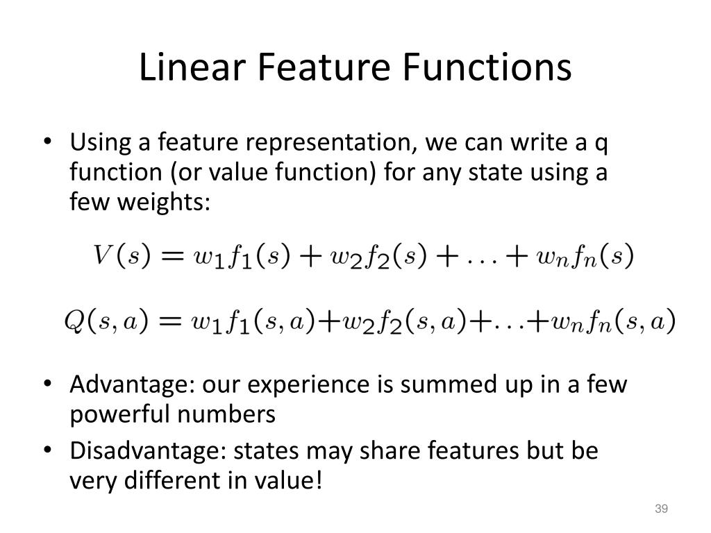 Linear Feature Functions • Using a feature representation, we can write a q function (or value function) for any state using a few weights: • Advantage: our experience is summed up in a few powerful numbers • Disadvantage: states may share features but be very different in value!