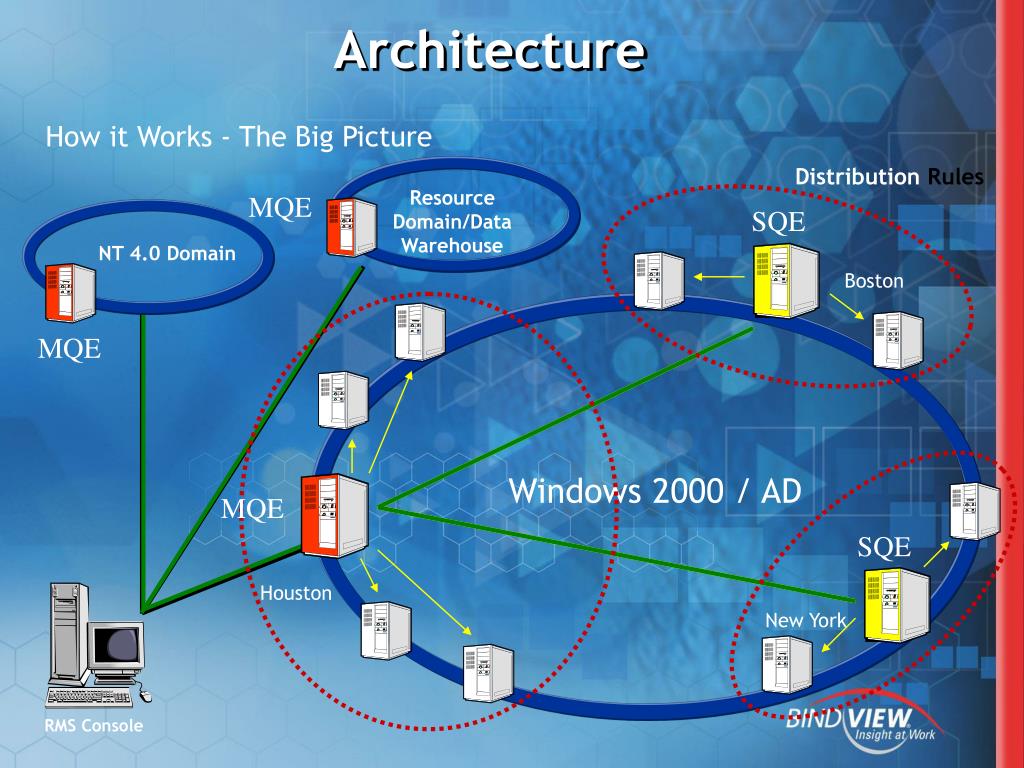 Distribution Rules RMS Console Architecture How it Works - The Big Picture Resource Domain/Data Warehouse MQE SQE NT 4.0 Domain Boston MQE Windows2000/ AD MQE SQE Houston New York