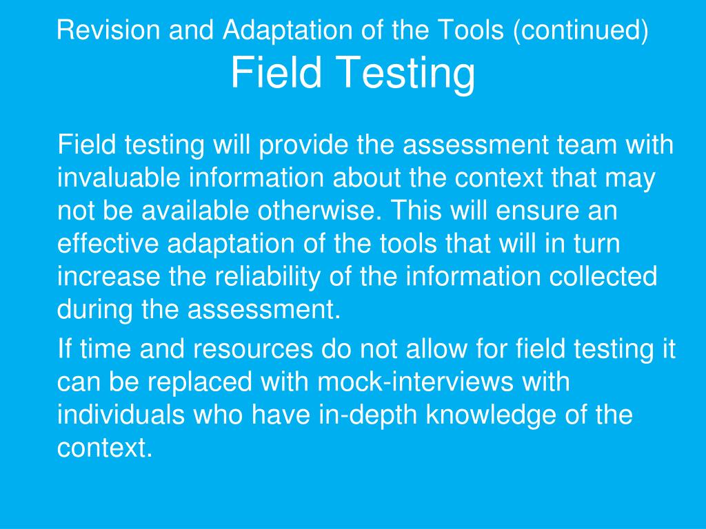 Revision and Adaptation of the Tools (continued)Field Testing Field testing will provide the assessment team with invaluable information about the context that may not be available otherwise. This will ensure an effective adaptation of the tools that will in turn increase the reliability of the information collected during the assessment. If time and resources do not allow for field testing it can be replaced with mock-interviews with individuals who have in-depth knowledge of the context.