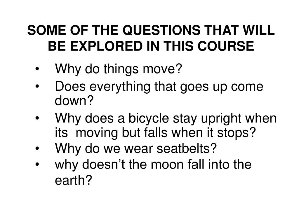 SOME OF THE QUESTIONS THAT WILL BE EXPLORED IN THIS COURSE • Why do things move? • Does everything that goes up come down? • Why does a bicycle stay upright when its moving but falls when it stops? • Why do we wear seatbelts? • why doesn’t the moon fall into the earth?