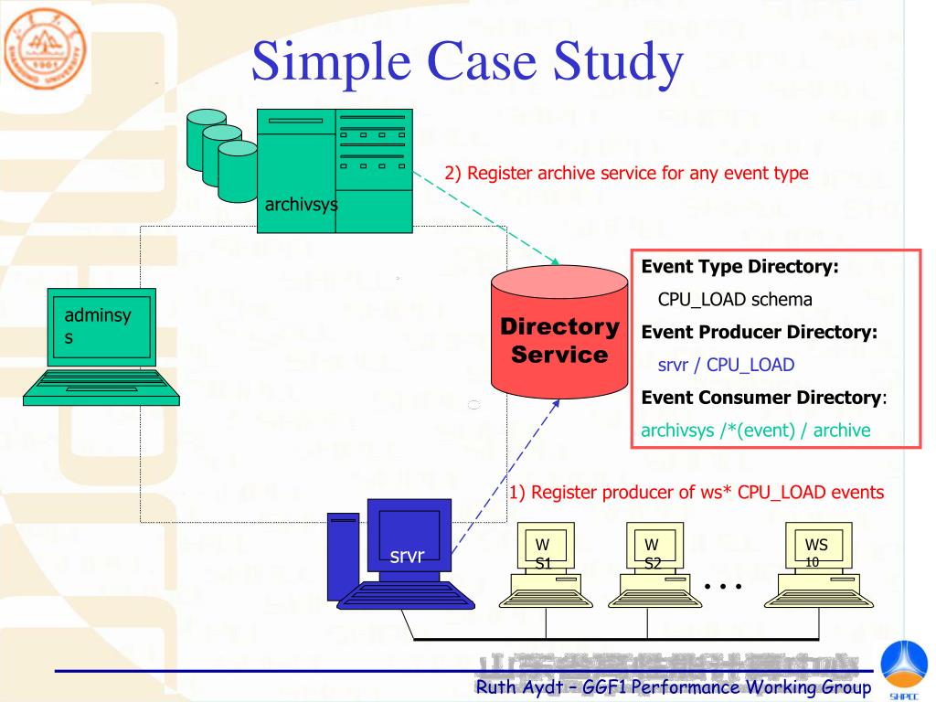 6) Locate ws* CPU_LOAD events 7) Subscribe to ws* CPU_LOAD events Events Ruth Aydt – GGF1 Performance Working Group Simple Case Study archivsys archivsys Event Type Directory: CPU_LOAD schema Event Producer Directory: srvr / CPU_LOAD Event Consumer Directory: archivsys /*(event) / archive Events Directory Service adminsys srvr WS1 WS2 WS10 . . .