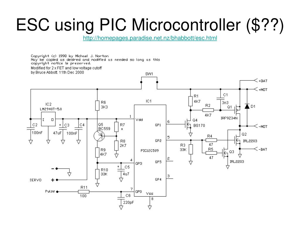 ESC using PIC Microcontroller ($??) http://homepages.paradise.net.nz/bhabbott/esc.html