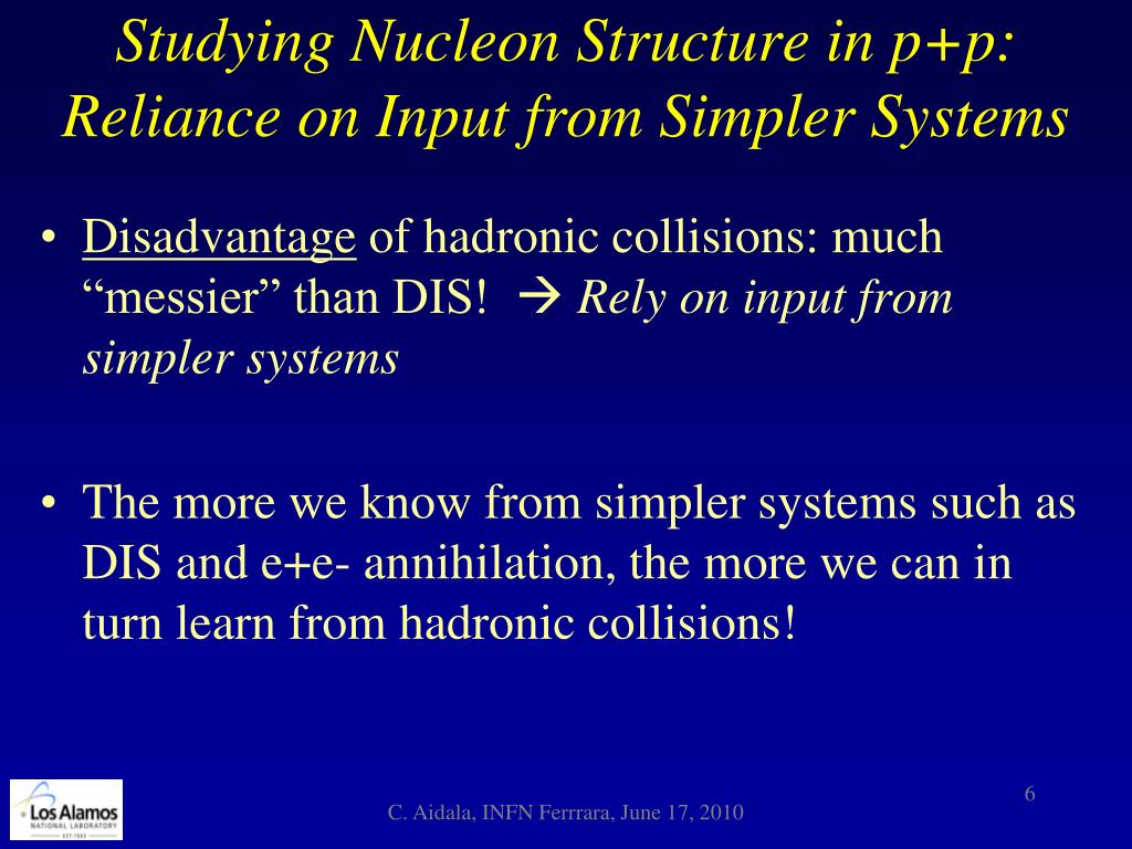 Studying Nucleon Structure in p+p: Reliance on Input from Simpler Systems • Disadvantage of hadronic collisions: much “messier” than DIS! Rely on input from simpler systems • The more we know from simpler systems such as DIS and e+e- annihilation, the more we can in turn learn from hadronic collisions! C. Aidala, INFN Ferrrara, June 17, 2010