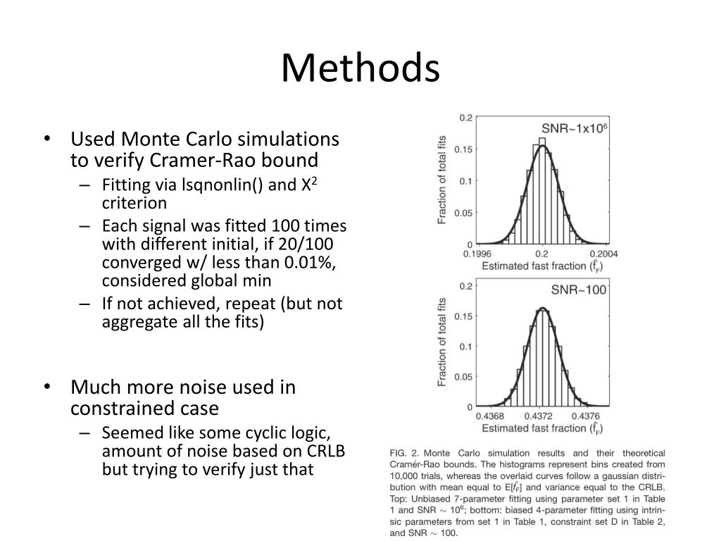 Methods • Used Monte Carlo simulations to verify Cramer-Rao bound • Fitting via lsqnonlin() and X2 criterion • Each signal was fitted 100 times with different initial, if 20/100 converged w/ less than 0.01%, considered global min • If not achieved, repeat (but not aggregate all the fits) • Much more noise used in constrained case • Seemed like some cyclic logic, amount of noise based on CRLB but trying to verify just that