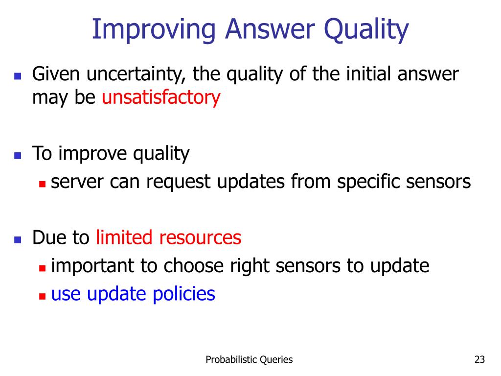 Improving Answer Quality • Given uncertainty, the quality of the initial answer may be unsatisfactory • To improve quality • server can request updates from specific sensors • Due to limited resources • important to choose right sensors to update • use update policies Probabilistic Queries