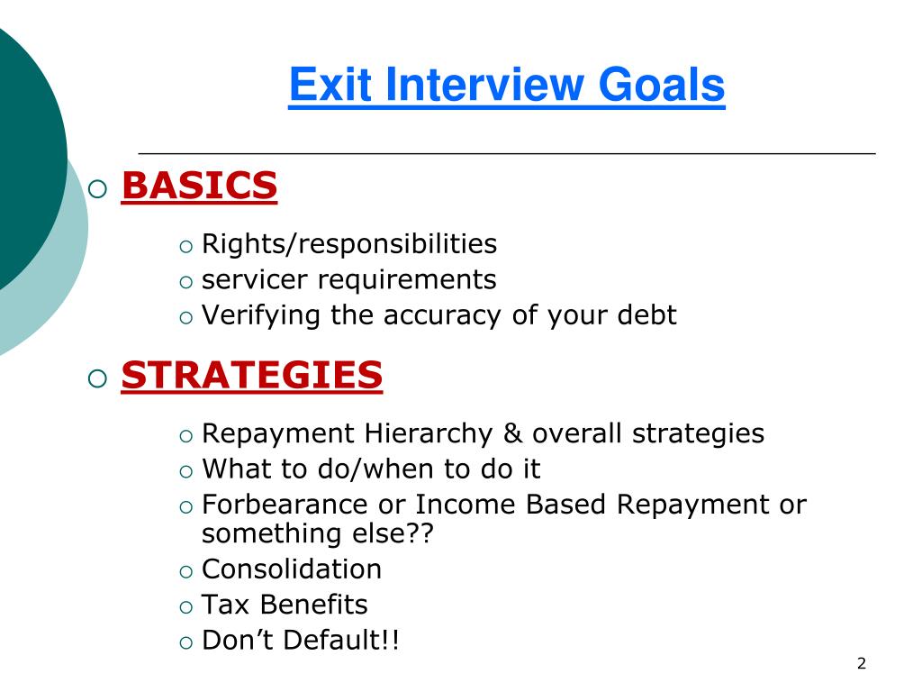 Exit Interview Goals • BASICS • Rights/responsibilities • servicer requirements • Verifying the accuracy of your debt • STRATEGIES • Repayment Hierarchy & overall strategies • What to do/when to do it • Forbearance or Income Based Repayment or something else?? • Consolidation • Tax Benefits • Don’t Default!!