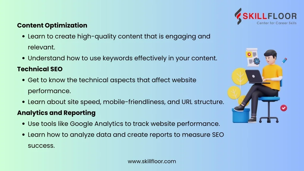 Content Optimization Learn to create high-quality content that is engaging and relevant. Understand how to use keywords effectively in your content. Technical SEO Get to know the technical aspects that affect website performance. Learn about site speed, mobile-friendliness, and URL structure. Analytics and Reporting Use tools like Google Analytics to track website performance. Learn how to analyze data and create reports to measure SEO success. www.skillfloor.com