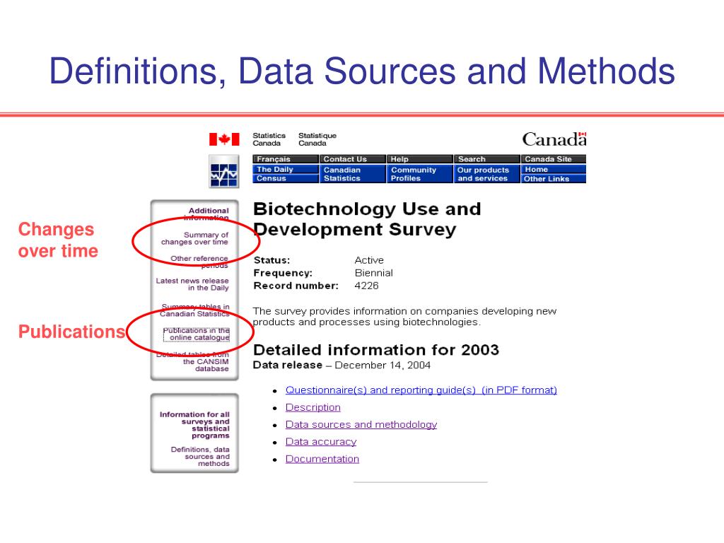 What Do I Need to Know? Finding them is the big challenge • Try the codebook; read the footnotes • We love Definitions, Data Sources and Methods: • Check individual surveys for sightings of “Additional Documentation” and “Summary of Changes over Time” • Search Online Catalogue and STC search: • “user guide, manual, handbook, sources, method*, concepts” plus the subject or survey you need