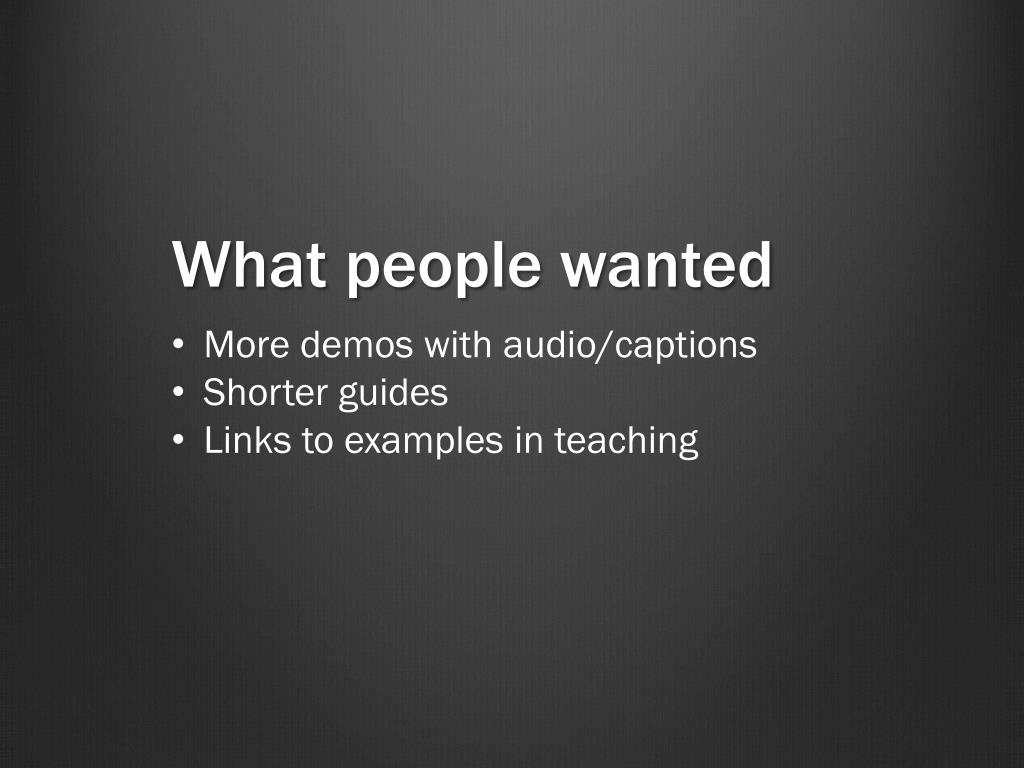 What people wanted • More demos with audio/captions • Shorter guides • Links to examples in teaching