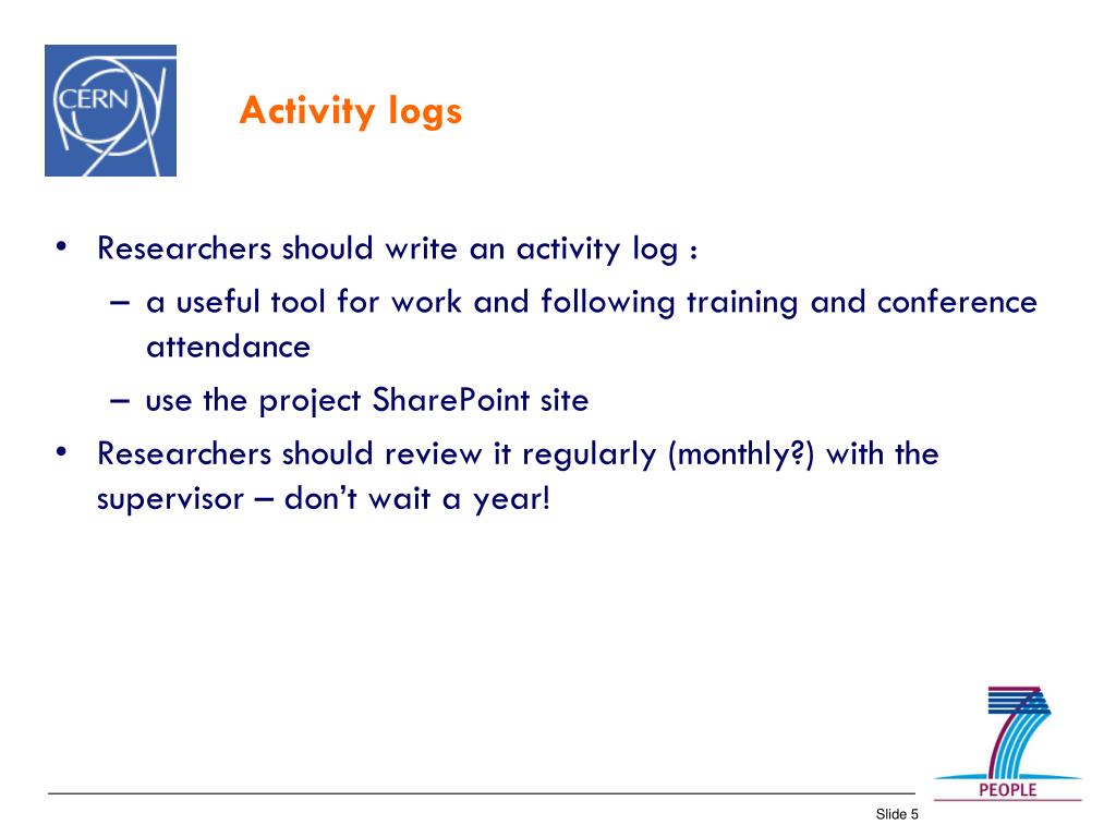 Activity logs • Researchers should write an activity log : • a useful tool for work and following training and conference attendance • use the project SharePoint site • Researchers should review it regularly (monthly?) with the supervisor – don’t wait a year!