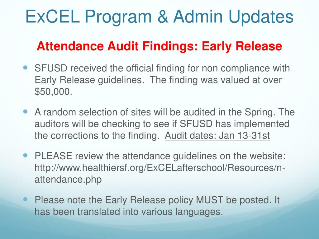 ExCEL Program & Admin Updates Attendance Audit Findings: Early Release • SFUSD received the official finding for non compliance with Early Release guidelines. The finding was valued at over $50,000. • A random selection of sites will be audited in the Spring. The auditors will be checking to see if SFUSD has implemented the corrections to the finding. Audit dates: Jan 13-31st • PLEASE review the attendance guidelines on the website: http://www.healthiersf.org/ExCELafterschool/Resources/n-attendance.php • Please note the Early Release policy MUST be posted. It has been translated into various languages.