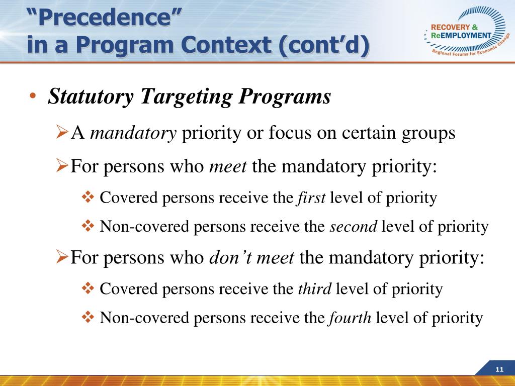 “Precedence”in a Program Context (cont’d) • Statutory Targeting Programs • A mandatory priority or focus on certain groups • For persons who meet the mandatory priority: • Covered persons receive the first level of priority • Non-covered persons receive the second level of priority • For persons who don’t meet the mandatory priority: • Covered persons receive the third level of priority • Non-covered persons receive the fourth level of priority 11