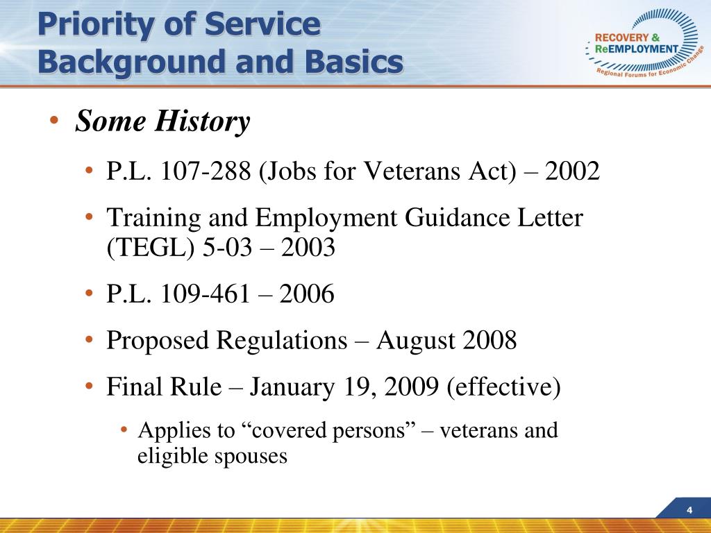 Priority of ServiceBackground and Basics • Some History • P.L. 107-288 (Jobs for Veterans Act) – 2002 • Training and Employment Guidance Letter (TEGL) 5-03 – 2003 • P.L. 109-461 – 2006 • Proposed Regulations – August 2008 • Final Rule – January 19, 2009 (effective) • Applies to “covered persons” – veterans and eligible spouses 4