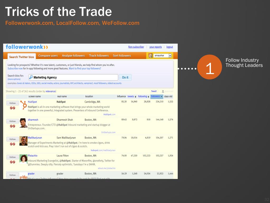 Tricks of the TradeFollowerwonk.com, LocalFollow.com, WeFollow.com 1 Follow Industry Thought Leaders