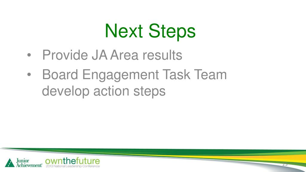 Next Steps Provide JA Area results Board Engagement Task Team develop action steps
