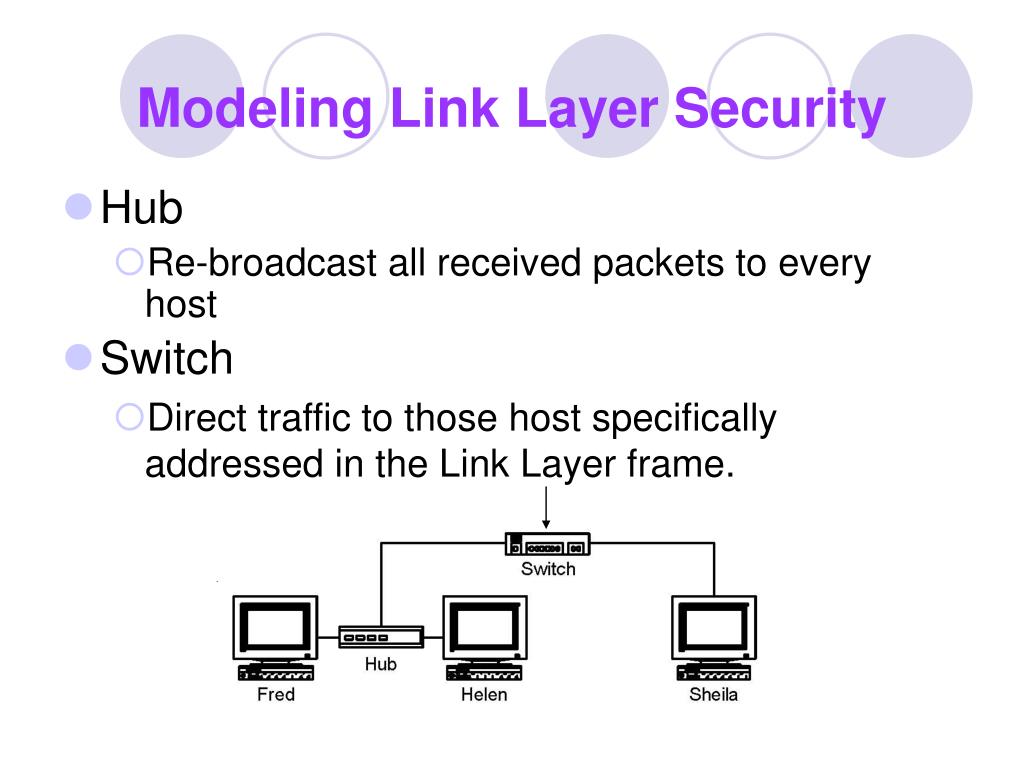 Modeling Link Layer Security • Hub • Re-broadcast all received packets to every host • Switch • Direct traffic to those host specifically addressed in the Link Layer frame.