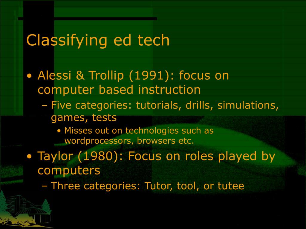 Classifying ed tech • Alessi & Trollip (1991): focus on computer based instruction • Five categories: tutorials, drills, simulations, games, tests • Misses out on technologies such as wordprocessors, browsers etc. • Taylor (1980): Focus on roles played by computers • Three categories: Tutor, tool, or tutee